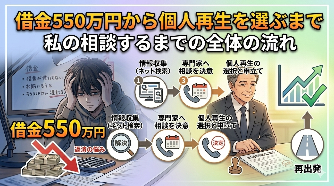 ※この記事は、借金550万円を経験した筆者が、債務整理を検討してから個人再生を選ぶまでの流れをまとめたものです。制度の専門解説ではなく、当時の体験をもとに書いています。